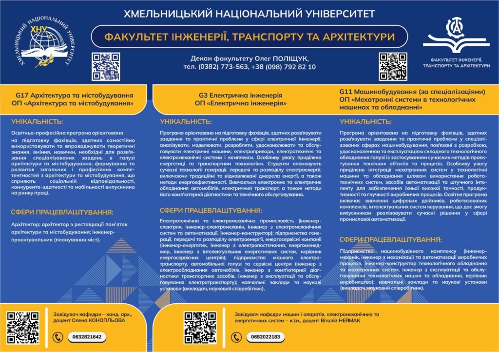 Факультет інженерії, транспорту та архітектури Хмельницького національного університету запрошує абітурієнтів приєднатися до дружньої студентської спільноти та обрати одну з актуальних і перспективних освітніх програм. Ми пропонуємо якісну інженерну підготовку, сучасну матеріально-технічну базу, участь у наукових дослідженнях, можливості практичного навчання та міжнародної співпраці.