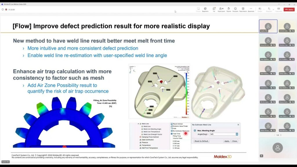 Програма вебінару охопила ключові інновації версії Moldex3D 2026, серед яких автоматизовані робочі процеси симуляції для прискорення проєктування, оптимізацію циклів лиття з метою зменшення дефектів і відходів, інтеграцію штучного інтелекту для точнішого прогнозування якості виливків, а також нові модулі для аналізу волокнистих композитів і мультикомпонентного лиття. Окрему увагу приділили інструментам для моделювання складних геометрій та інтеграції з CAD-системами.